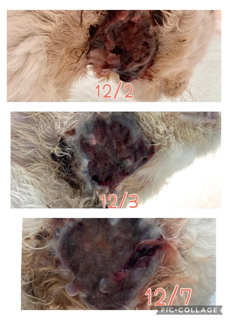 ジュクジュクしていた腫瘍部が、毎日のオゾン水での消毒と こまめな包帯の交換でかさぶたのようになってきたように見えます。