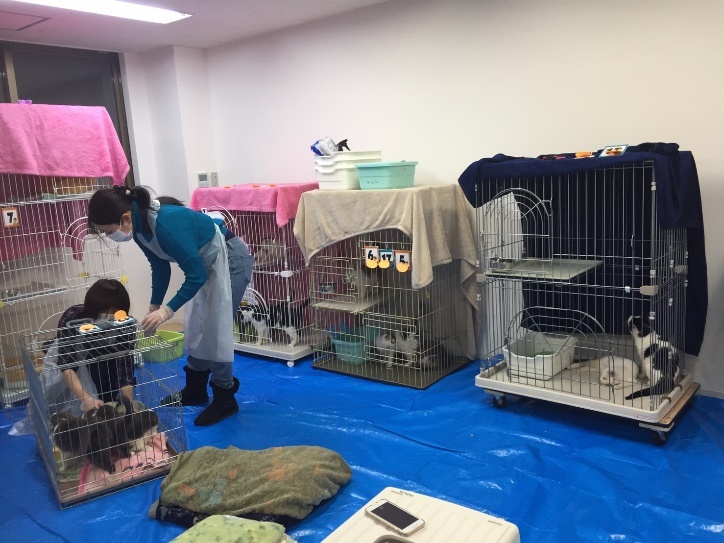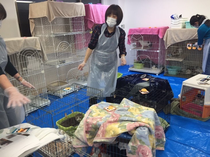 新しくできた一次待機施設にて個体の管理、預かりボランティアさんが
