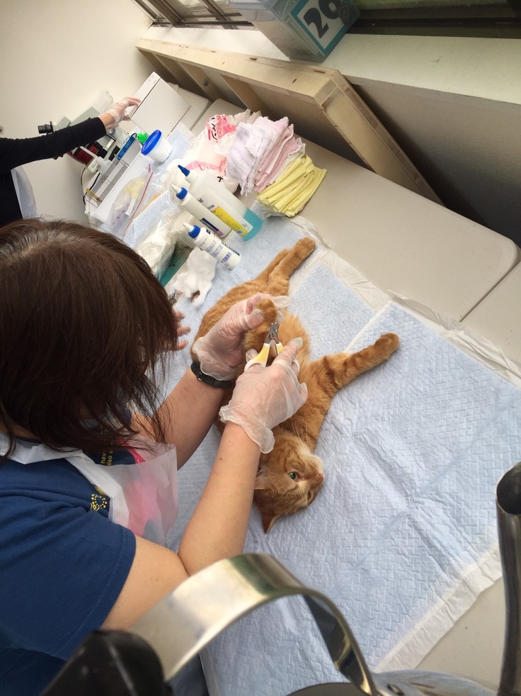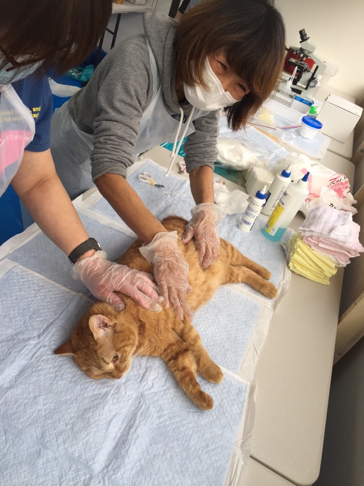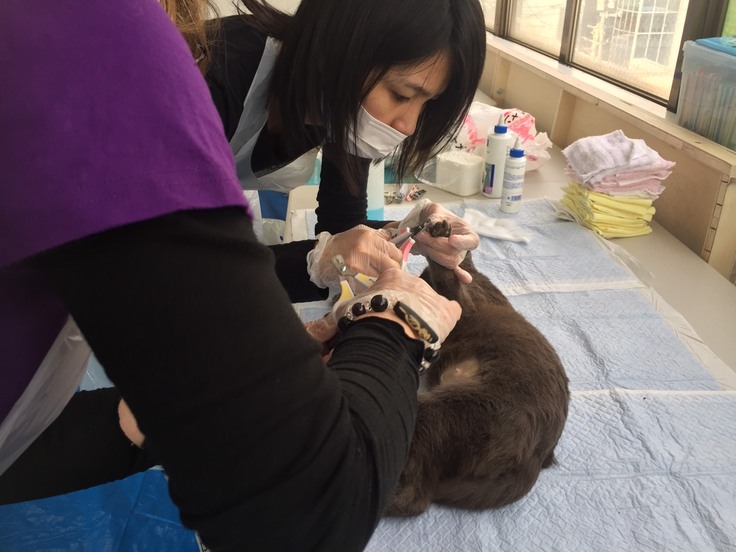 麻酔で眠っている間にボランティアさんが、耳のケア、爪切りお口の中の確認などをし便検査の用意などの作業の手伝いも行いました。