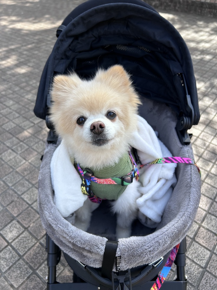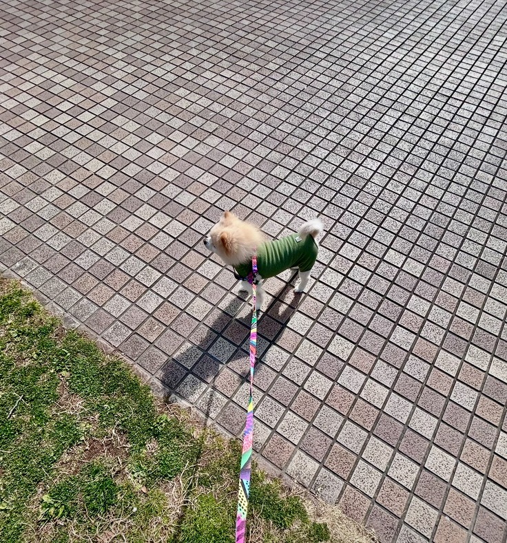 「排泄のための外出は獣医さんからOKをもらっていて、2分くらいはカートから降りて芝生で過ごすよ。