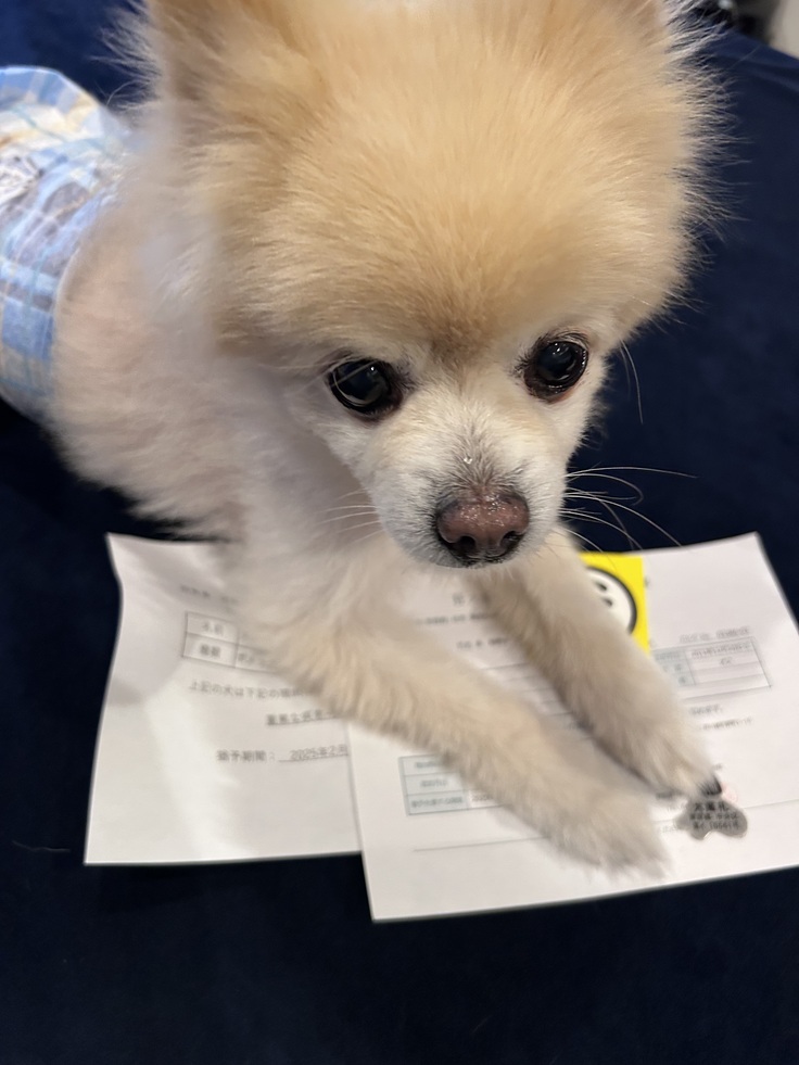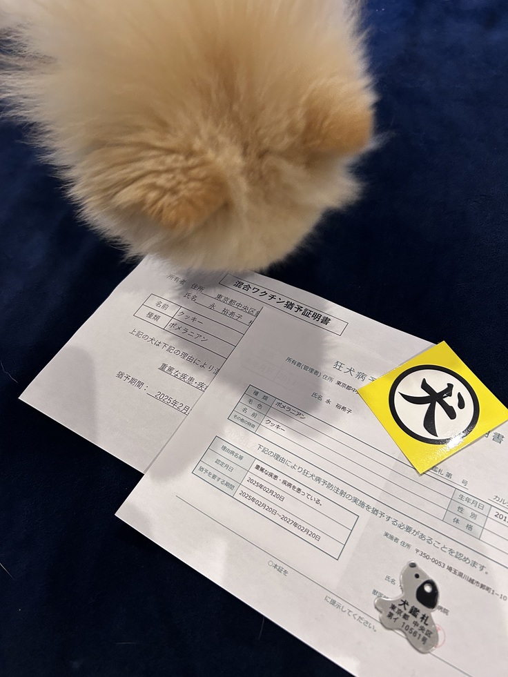 スノーボールは狂犬病ワクチンと混合ワクチンを予約していますが、クッキーは心臓病のために接種ができないため、獣医さんに猶予証明書を書いてもらいました。