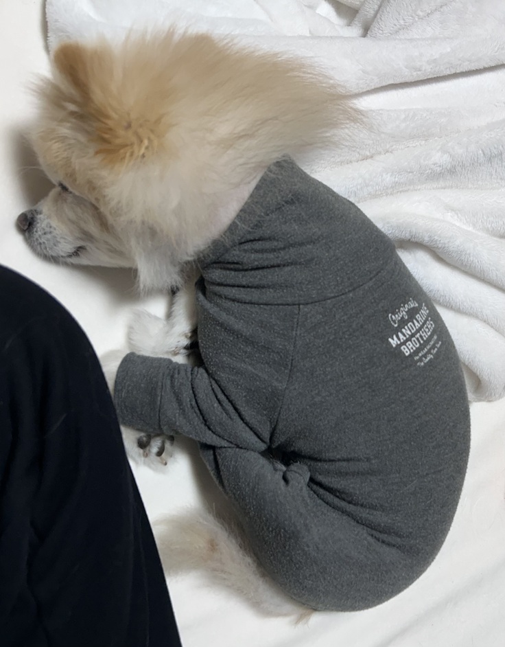 「楽しかったお散歩の後は暖かい毛布の上でお昼寝するよ。起きたらすぐにごはんを食べるから、ちょっとしたら起こしてね…Zz…」