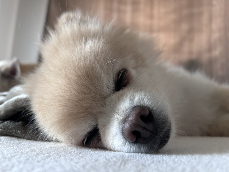 川沿いで日向ぼっこ中、クッキーも気持ち良さそうに良い顔をしていました!可愛い!