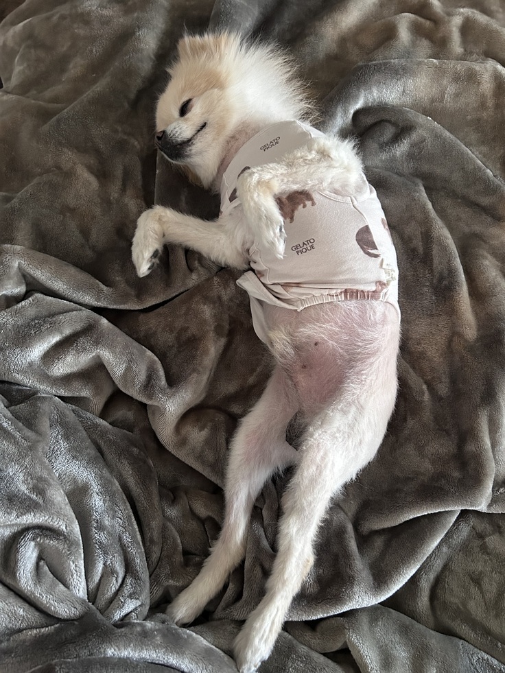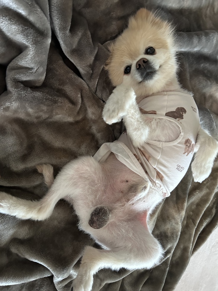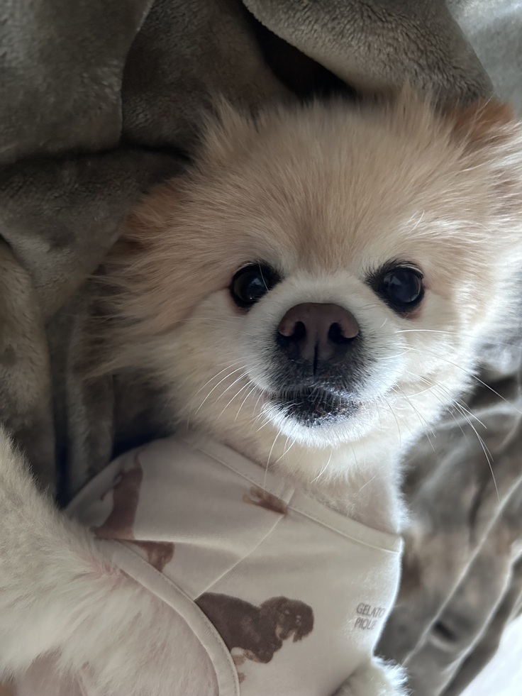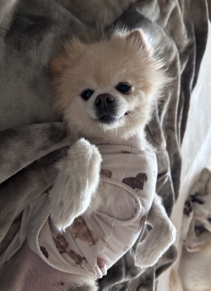 ココアのお下がりであるダックス柄の洋服を着たクッキー。ココアみたいに長生きしてね。