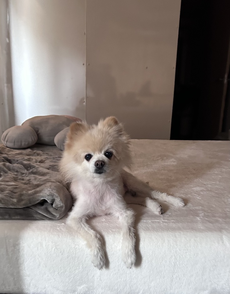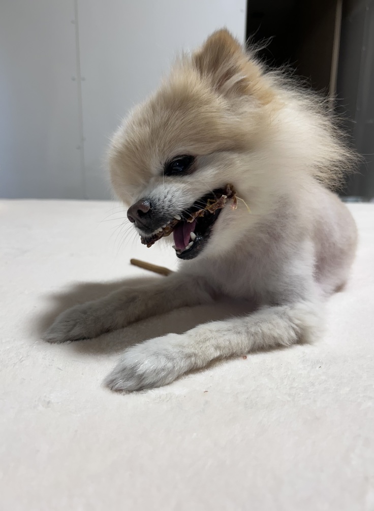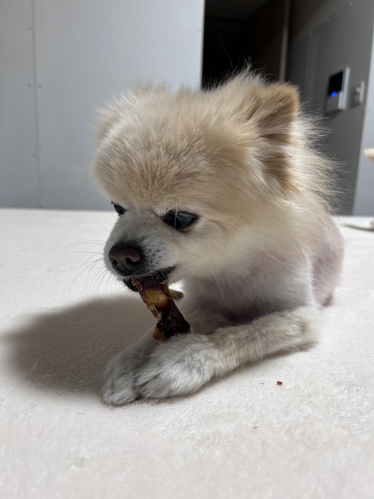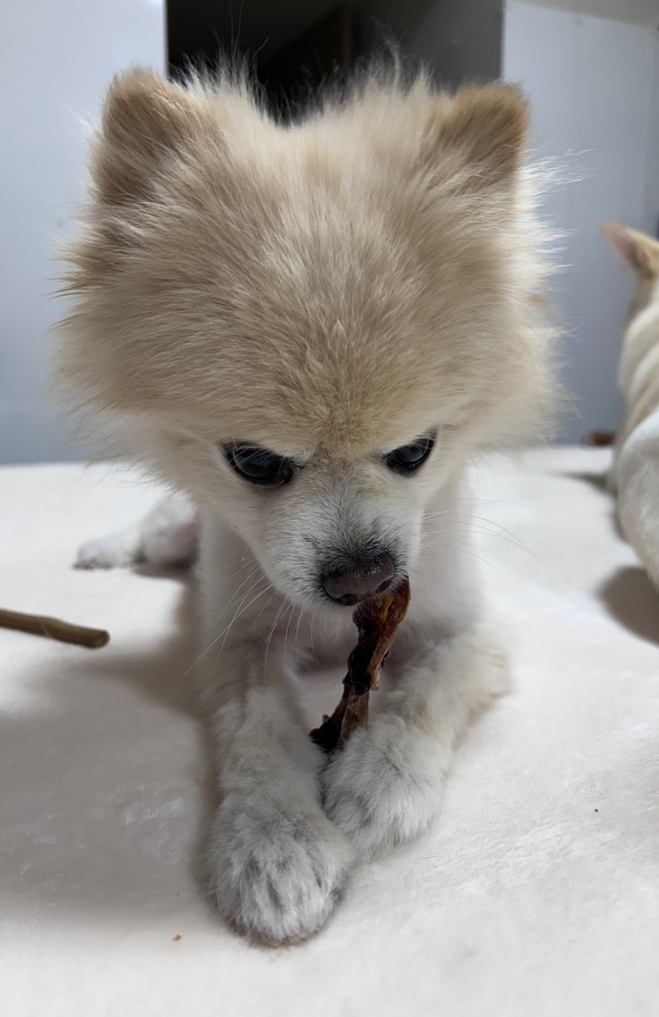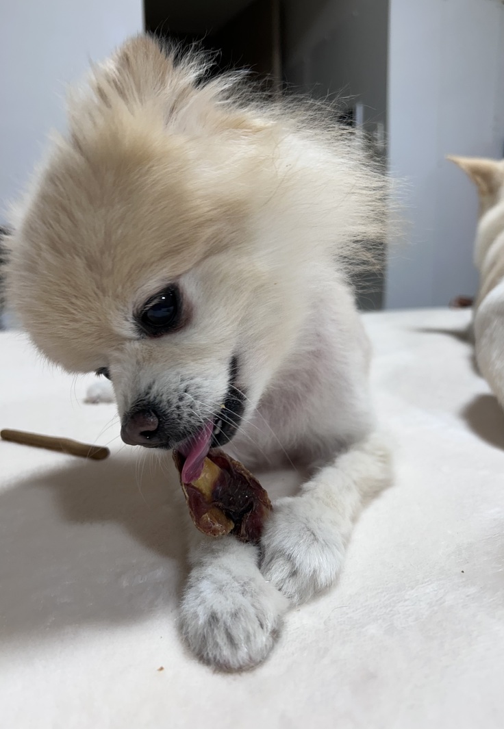 「今のおうちは、おやつをいっぱいもらえるよ!スノーボールも僕も、いっぱい甘やかしてもらえるんだ!お母さんは、過去の犬生の分の愛情を僕たちにくれようとしているみたい。」