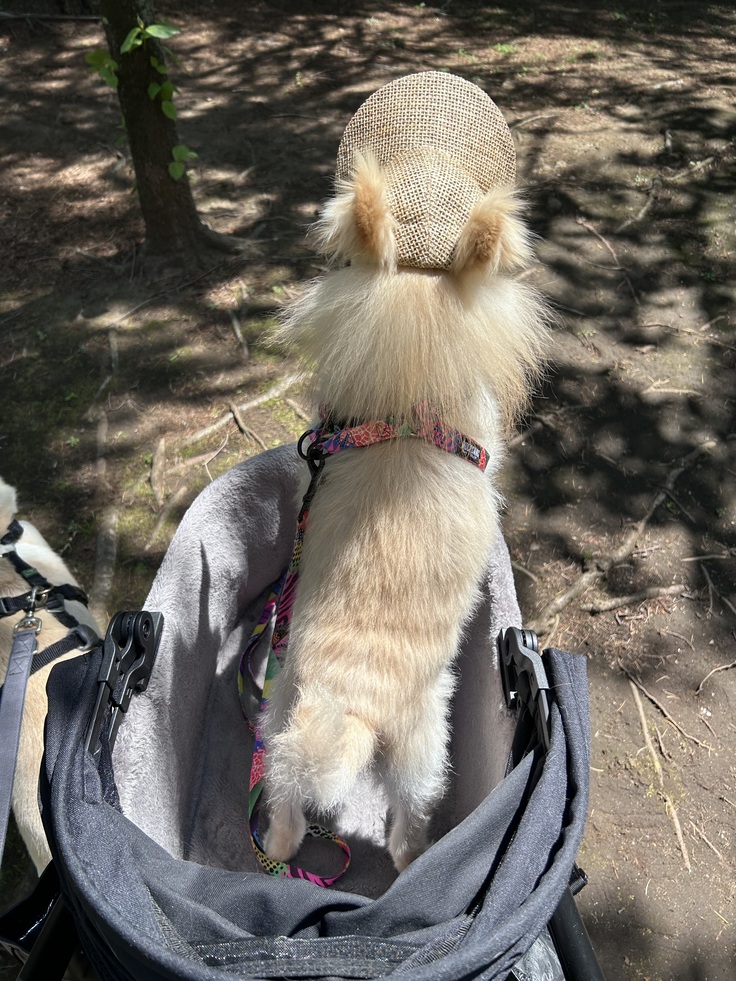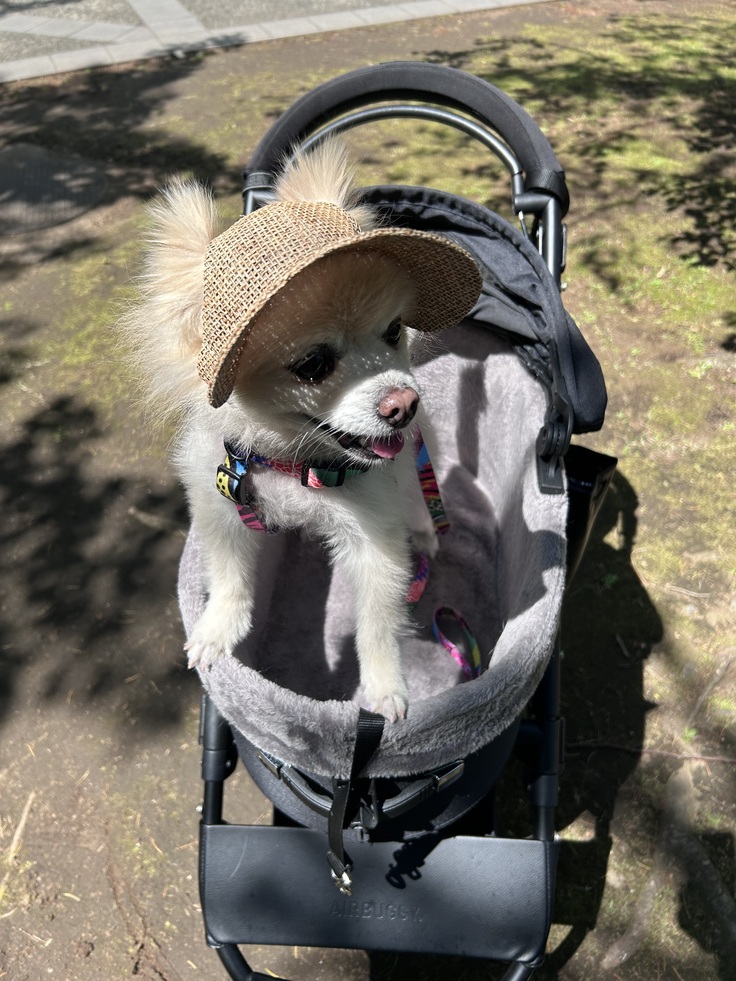 日焼け止めを塗らない私には、お散歩中は、帽子が必須です。クッキーも被っている方が涼しく感じればと思います。