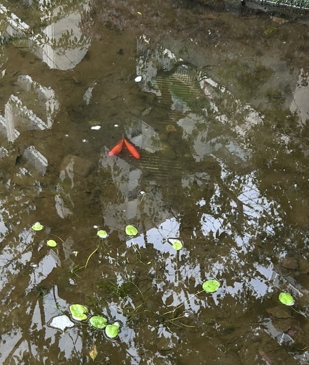 お散歩ルート沿いの公園に、最近気がついたんですが、誰かが金魚を放しています。東京は雨が止んだあと、この池も水は満水状態です。
