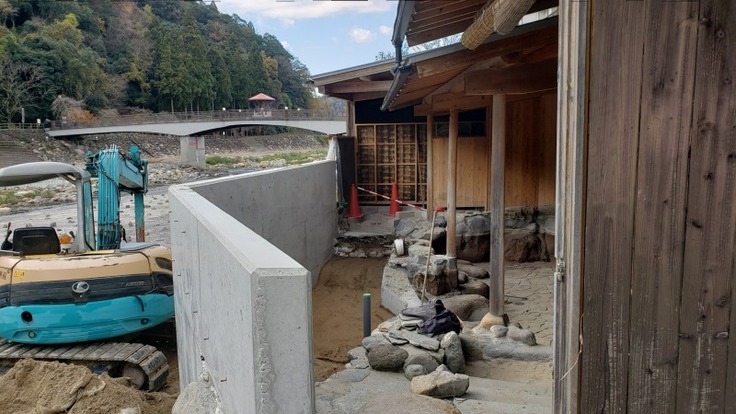 台風の被害ですぐにでも全体的な復旧作業に取り掛かりたかったのですが、当館の建物の構造上、県が管理している河川敷に隣接しており、そちらも台風の被害で進入することができず、重機等も入れず、大々的な復旧作業は被害を受けてから3か月後にようやく開始となりました。当時の被害状況ではわからなかったことが日に日にあちらこちらと判明し、その中でも当館五か所ある源泉のうちの一か所が壊されていることが判明し、ご宿泊頂いたお客様には多大なご迷惑をおかけしました。