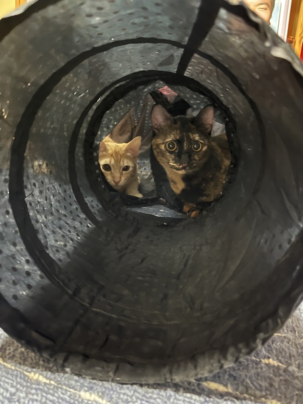 写真は、トンネル型のオモチャの中に姉妹で潜んでいる姿です。狙い顔もとても可愛いです😊
