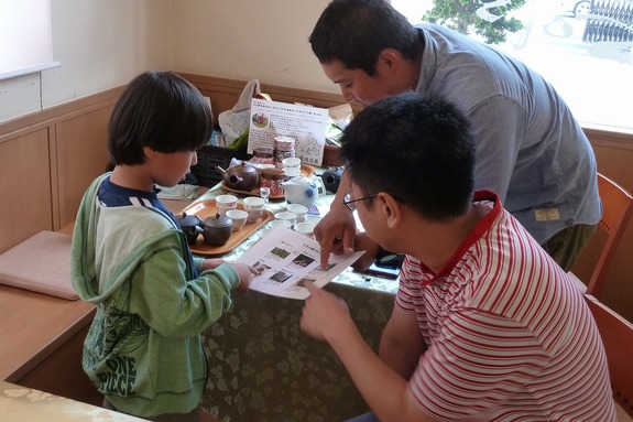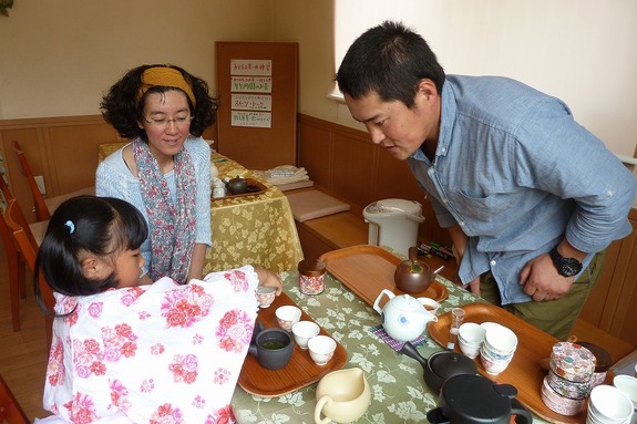 写真は、子供にお茶のいれ方を教えてあげているところです。