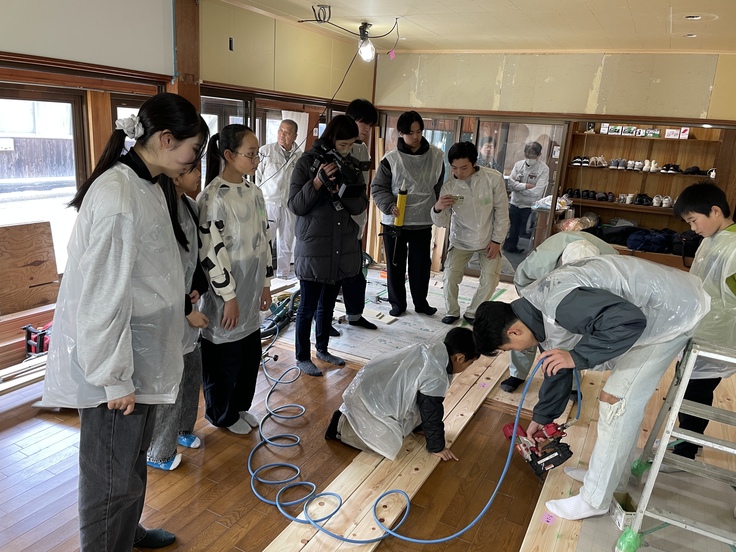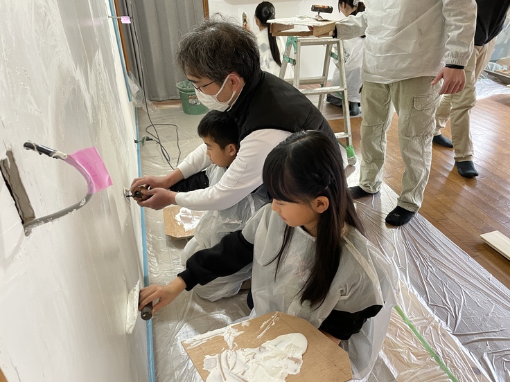 左官を体験するワークショップや大工さんの工具を使ってみるワークショップだけでなく、実際にフローリングを貼ってもらったり、壁に漆喰を塗ってもらったりしました💪