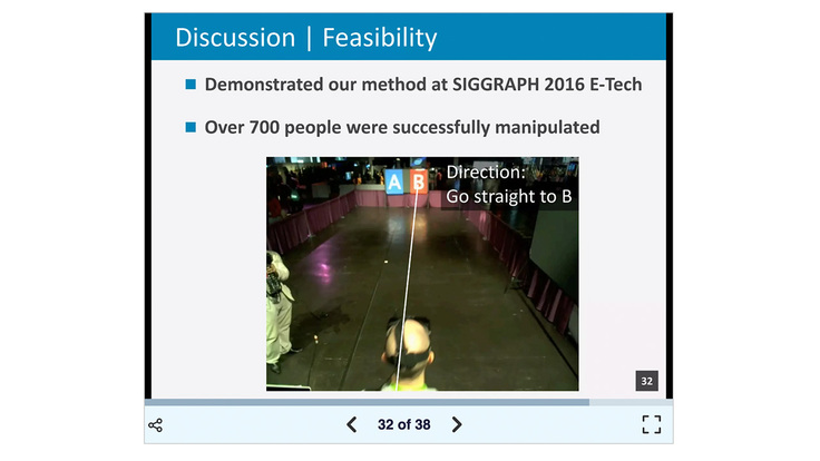 初めて鈴木がデモ展示を行った Optical Marionette (SIGGRAPH 2016) を例にあげると,参加者が一人ずつヘッドマウントディスプレイを装着して歩くという,回転率のあまり高くない展示にもかかわらず,700人以上が実演に参加しました。