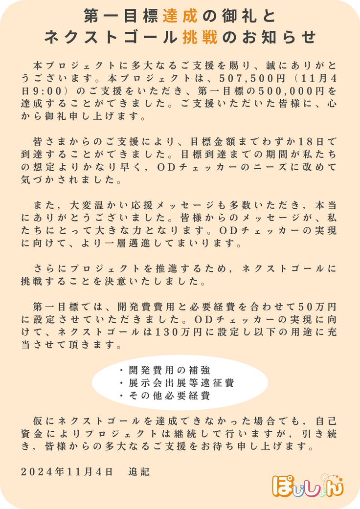 - 本プロジェクトにおいて開発するODチェッカーを市販するためには、医療機器の承認手続きを経る必要があります。現時点では、実用化できるほど開発が進んでいないため、本プロジェクトで集めた資金によって、開発が順調に進んだ場合、医療機器の承認手続きに向けて活動を本格的に始める予定です。