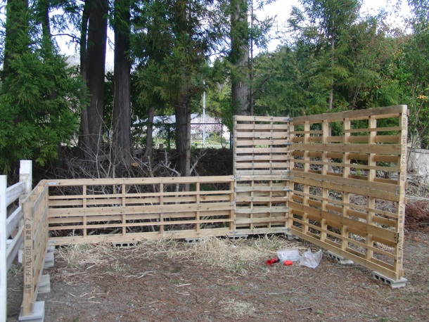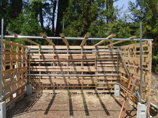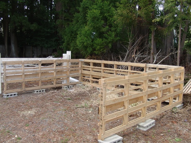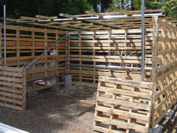 あとは足りない単管パイプを付けて、単管パイプとパレットをワイヤーでつなげて、前面に出入り口を作って、屋根を張って、内側に壁を貼って完成です。