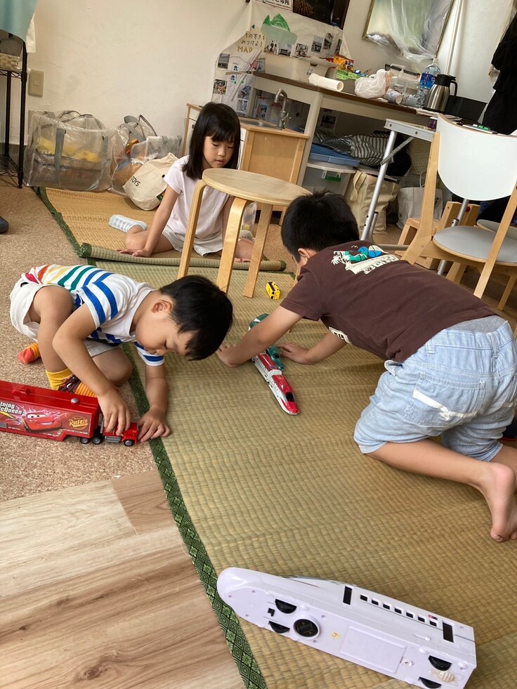電車や車のおもちゃで思い思いに遊ぶ子どもたち。