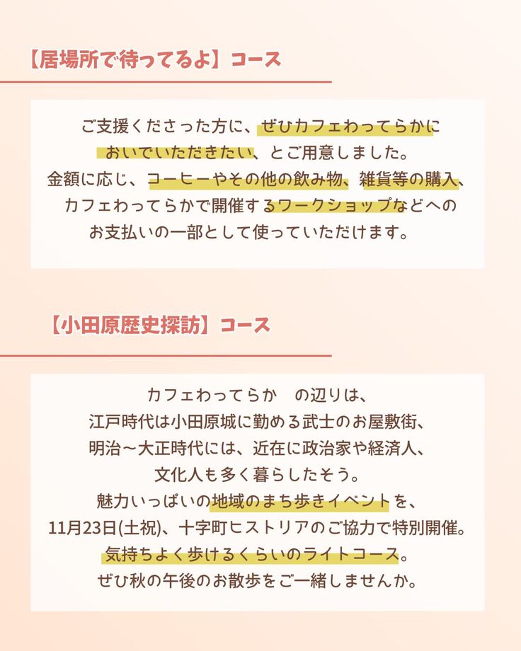 文字どおり、ご支援くださった方に、ぜひ、カフェわってらか においでいただきたい!との思いで考えました。