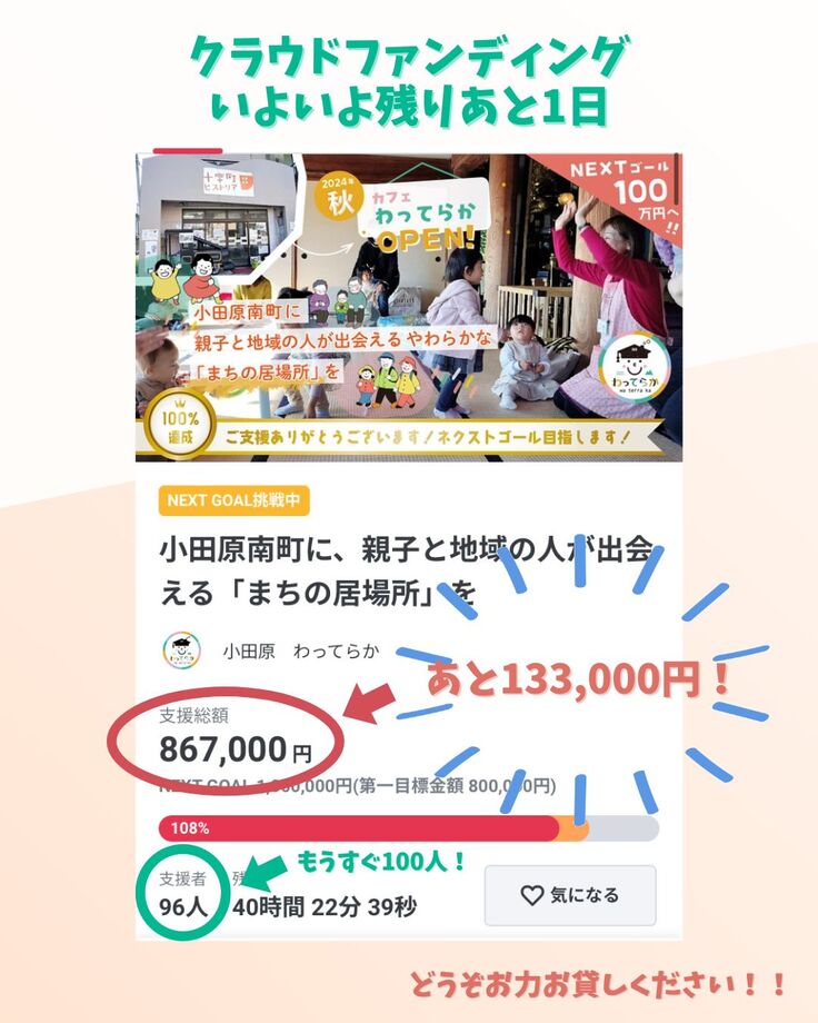 クラウドファンディングは、いよいよ残り"あと1日"となりました。