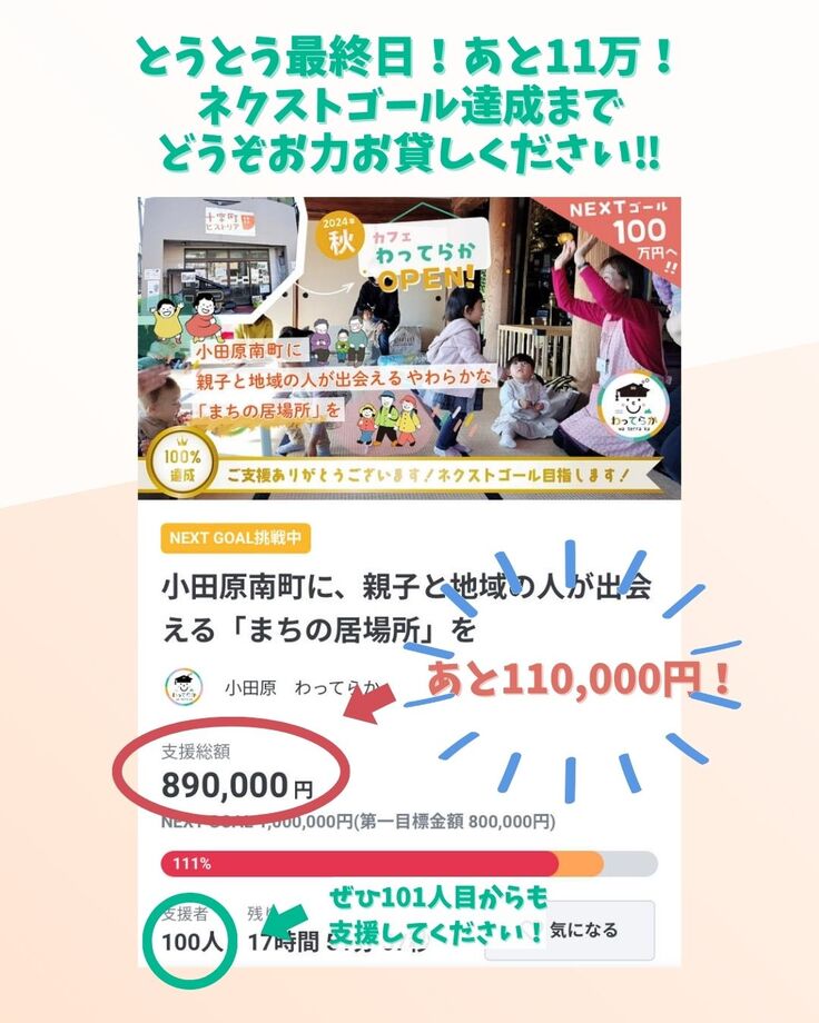 ご支援くださった方と一緒に、ネクストゴールの達成を喜びあい、居場所のオープンに向けて進んでいきたいと思っております。