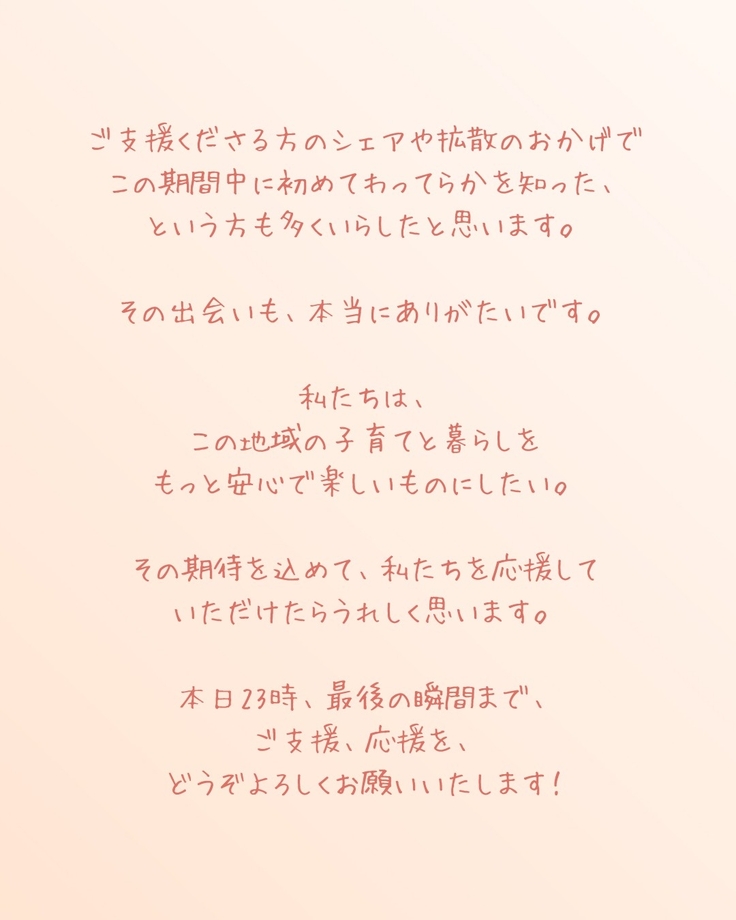 本日23時、最後の瞬間まで、ご支援、応援を、どうぞよろしくお願いいたします!
