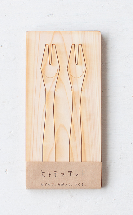 西粟倉村にある「西粟倉・森の学校」は国産材にこだわった材木屋さん。「森を育てる人」と、「暮らしを作る人」の間を繋ぎ、ワクワクする森と暮らしの未来を目指す会社です。その商品の一つとして販売されているのが手作りカトラリーキット『ヒトテマキット』です。多くの人にものづくりの楽しさを知ってもらいたい、ひと手間をかける時間の豊かさを知ってもらいたいという思いから生まれました。素材には、国産のヒノキの間伐材を使用。クラフトナイフや彫刻刀で好きな形に削り磨いて、自分だけの食器を作ることができます。