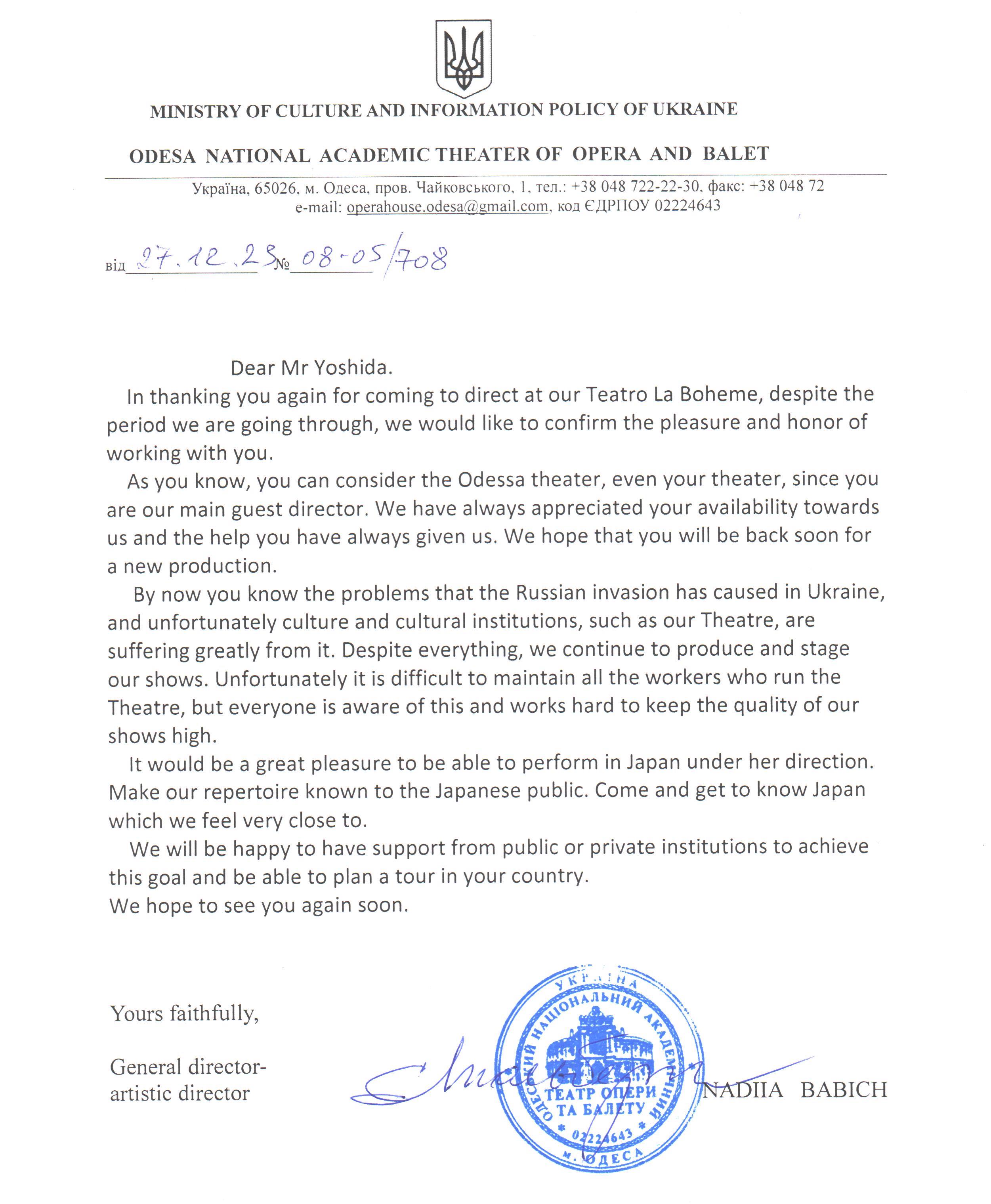 親愛なる吉田様。この度は、私たちが直面している時期にもかかわらず、「テアトロ・ラ・ボエーム」で演出をしていただき、再度お礼申し上げます。あなたと仕事ができることは、私たちにとって大変な喜びであり、名誉です。ご存知の通り、オデッサ劇場はあなたにとっても「あなたの劇場」と考えていただいて構いません。なぜなら、あなたは私たちの首席客演指揮者だからです。私たちは常に、あなたが私たちに対して示してくださるご協力と、常に私たちを助けてくださることに感謝しています。新しい公演のために、あなたがすぐに戻ってきてくださることを願っています。