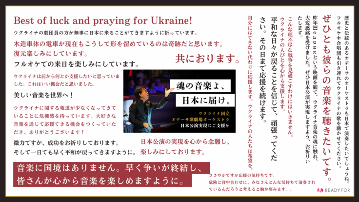 ・戦火の中、人々を励ます音楽を届け続けるみなさんを応援したいです。コンサートで無事にお目にかかれるのを楽しみにしています。