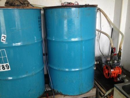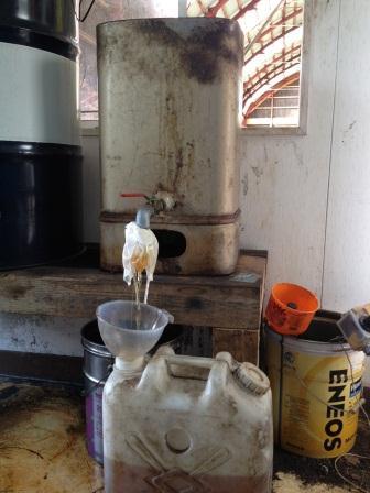 写真は手作りのバイオディーゼル製造機です。二枚目の写真は出来上がった燃料の