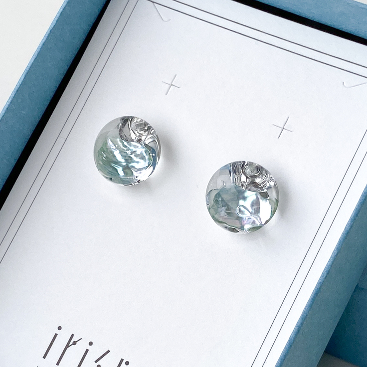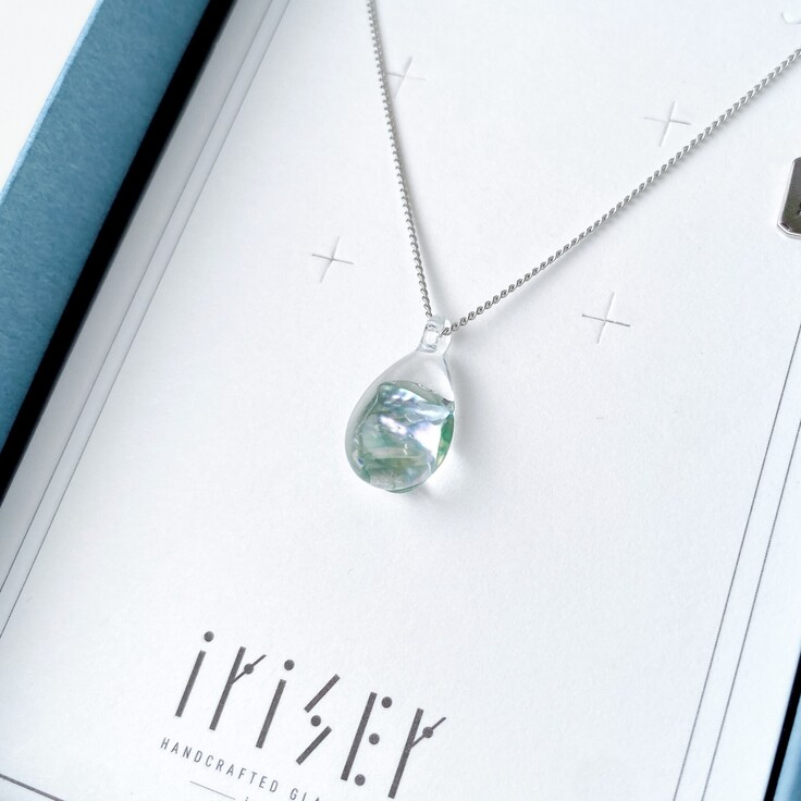 「三陸翡翠あわび×iriser -awase-」は、iriser様の繊細なガラスの技術と、アワビの稚貝の殻が持つ天然の美しい輝きが融合した、まさに唯一無二の作品です。光の当たり方によって表情を変えるガラスと、見る角度で色味が変化するアワビの貝殻が、互いを引き立て合い、深い輝きを放ちます。
