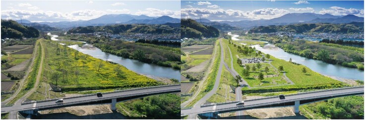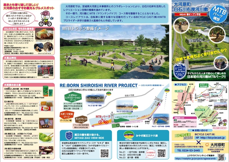 大河原町は、現在、白石川の河川敷に“賑わいと交流が新しいつながりを生む空間創出”をコンセプトにサイクリング・ウォーキングロード、パークゴルフ場、多目的広場、そしてキッズバイクからMTBまで幅広い世代に楽しんでもらえるMTBパークの整備を行うこととしています。