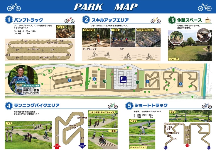 今回整備を行うMTBパークは、パンプトラックを含んだ3つのコースとスキルアップエリアが同時に楽しめるパークとなります。春には、桜樹の下で楽しめます。また、桜が散った頃には菜の花による黄色一面の中で楽しめます。駐車場や休憩スペースも十分に確保しましたので、子どもも大人も誰もが楽しめるパークになります。 今後、河川敷全体の整備が完成することにより、更に利用しやすい環境が生まれ年間を通して楽しむことができる河川敷となります。