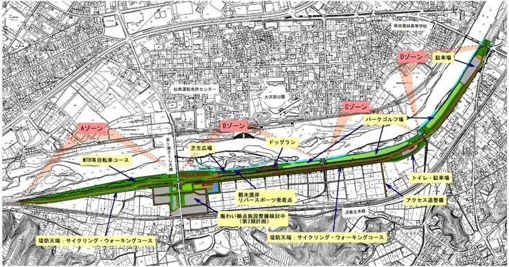 そこで生まれ変わるエリアである白石川右岸の河川敷について令和元年に新たな賑わい交流空間の創出を目指し、白石川右岸河川敷整備事業の基本計画を策定しました。基本計画では、サイクリング・ウォーキングロード、パークゴルフ場、賑わい交流施設などを計画してます。 MTBパークの整備は、子どもたちやサイクリストから気軽に自転車が練習できたり楽しめるフィールドがほしいという要望からこのプロジェクトを立ち上げました。