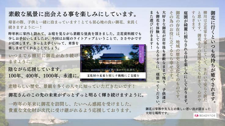 立花家の歴史が約400年ものときを経て、今もなおこの地にあり続けていること、そして、一人でも多くの皆様にこの取り組みを知っていただき、文化財の景色が紡がれる明るい未来を作りたく、この人数目標を掲げております。