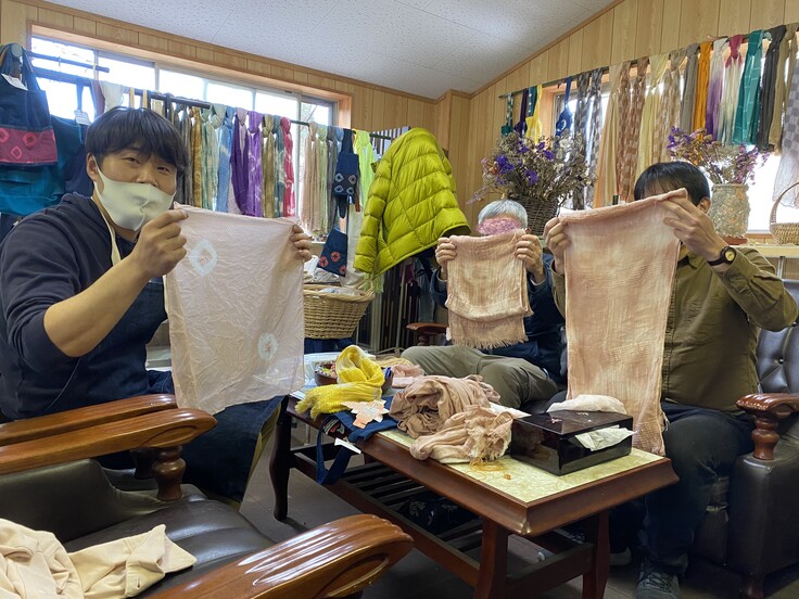 小豆染め体験では、ご自身で絞りを入れていただいたストールとハンカチ、ご持参いただいた品の染色をしていただきました。講師となる浦上染料店の浦上社長には、繊維の街となった児島の歴史や染色の仕組み、現在の取り組みや染色についての疑問などについてお話していただき、参加者の皆様も熱心に聞き入っていました。