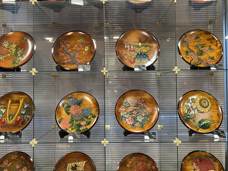 表面に漆を塗り染み込ませ、乾かし、磨き、また漆を塗るといった、何度も繰り返し行われる作業工程も見学させていただきました。立体感を表現するために一日に一工程、完成までにおよそ20工程を必要だとされ、丹念に手間暇をかけるからこそ、美しい輝き、丈夫な作品になるようです。