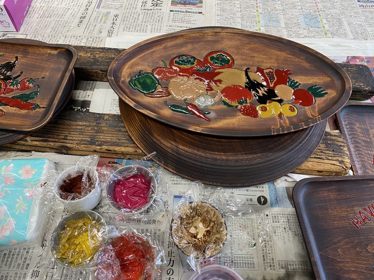 特色である木地(栃・欅・桐・桂材の木目)を生かし、野菜・果物・花・古瓦等の模様を図柄にして彫刻し、色漆で着色しそれに日本産生漆を摺り込み漆で重ね塗りして仕上げているので丈夫な器です。