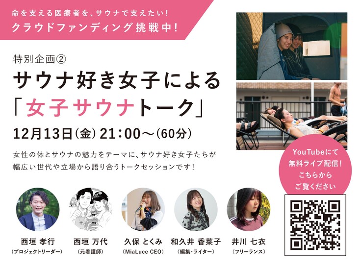 今回、女性の体とサウナの魅力について知っていただくべく、本日13日21:00から1時間で、Youtube配信を行います!