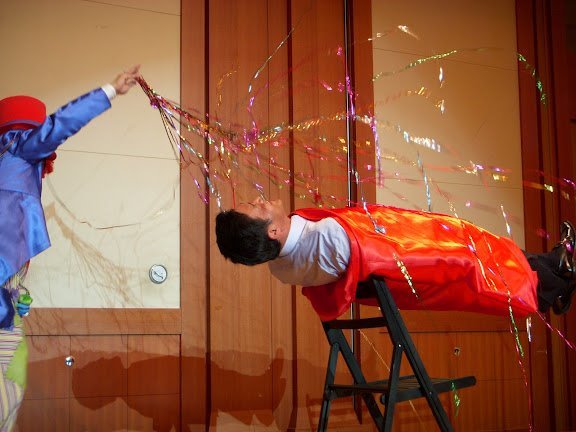 時には、ドクターやナース、院長までもマジックに巻き込み、写真のように空中に浮かせてしまうこともあります。