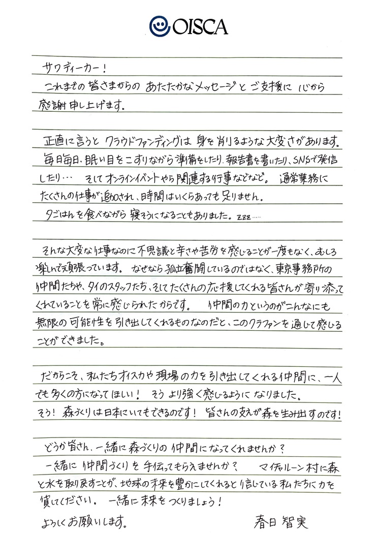 仲間の力というのがこんなにも無限の可能性を引き出してくれるものなのだと、このクラファンを通じて感じることが出来ました。