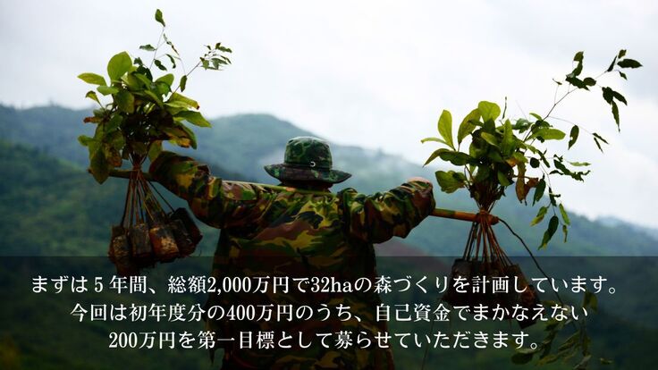 まずは5年間、総額2,000万円で32ヘクタールの森づくりを計画しています。初年度分の400万円の