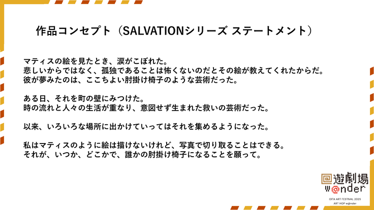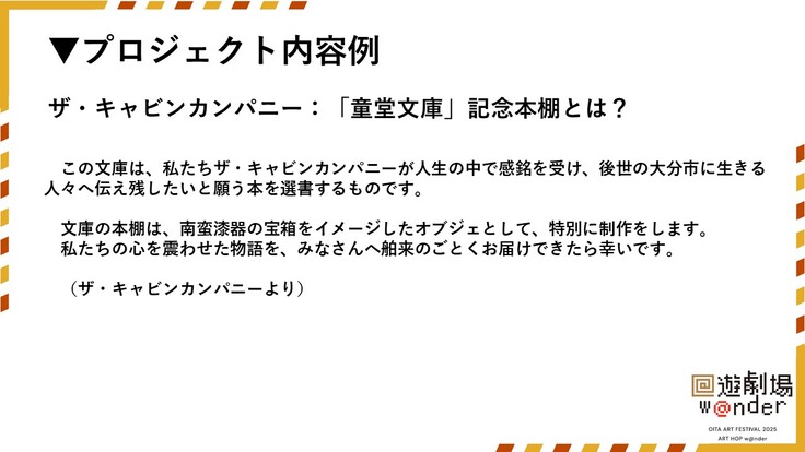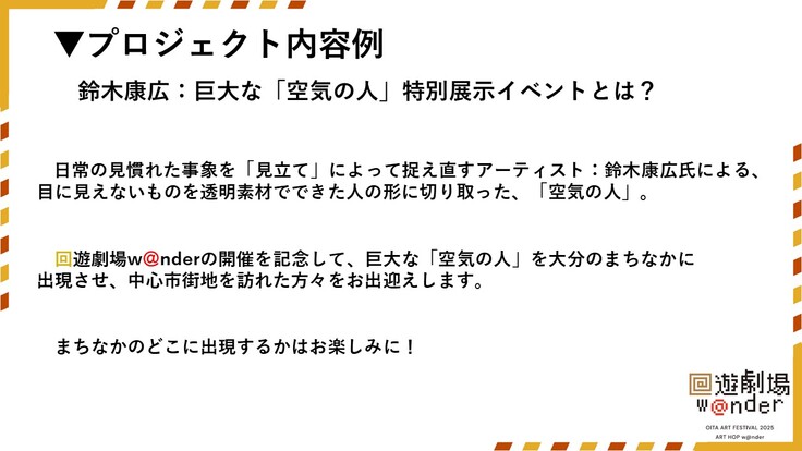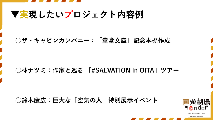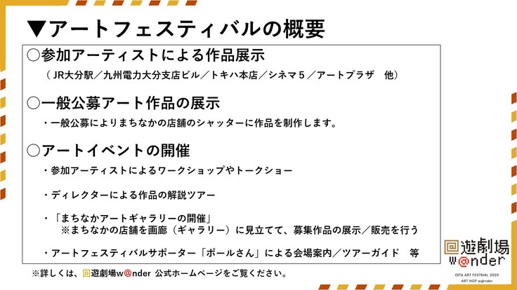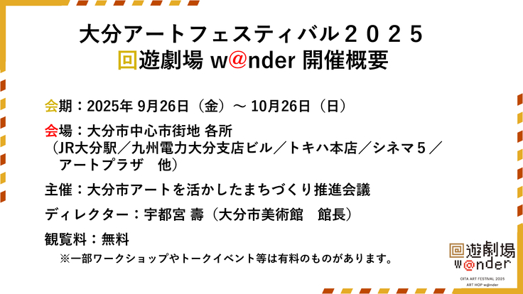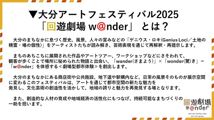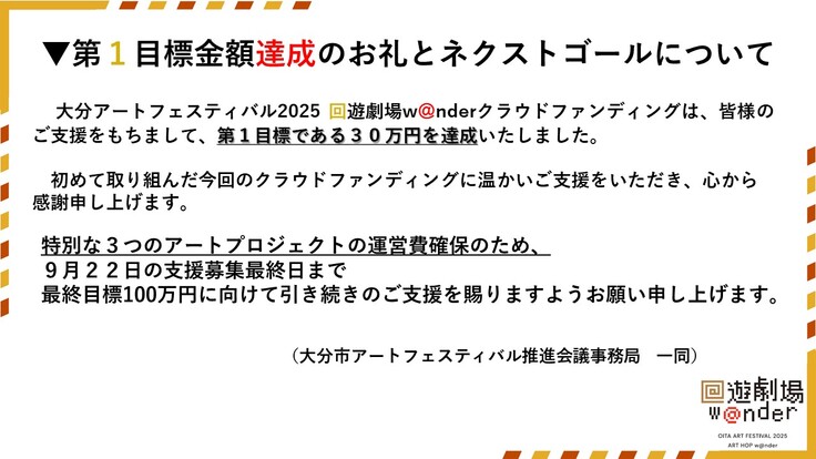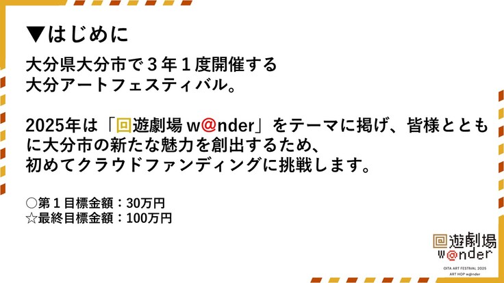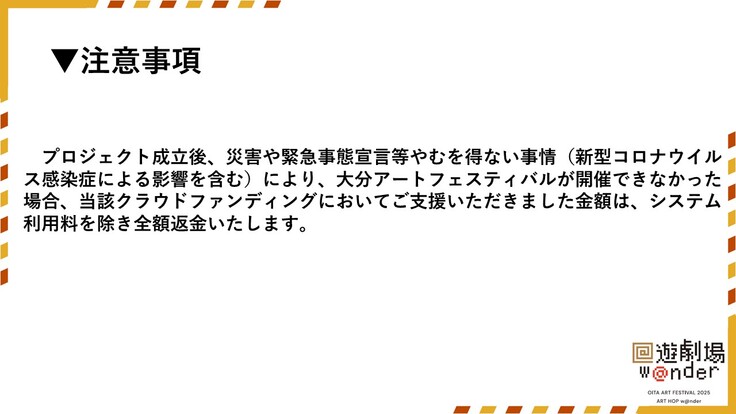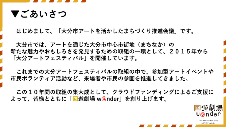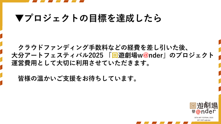 大分市アートを活かしたまちづくり推進会議が大分アートフェスティバル2025 回遊劇場w@nderを開催します。目的は、アートを通じて大分市の中心市街地の都市空間の新たな魅力を発見し、文化芸術の創造性を活かして、地域の誇りと魅力を再発見する場とすること、また、創造的な人材の育成や地域経済の活性化にもつなげ、まちづくりの一助を担うことです。 ご支援いただいた資金は、クラウドファンディング手数料等の費用を除き、すべて当該フェスティバルにおけるプロジェクト運営費に充てさせていただきます。