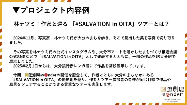 - 林ナツミ:回遊劇場w@nder限定ツアー参加券コースのリターン(作者と巡る#SALVATION in OITA ツアー参加券)の対象ツアーについては、2025年10月25日(土)午後に開催予定です。詳細日時及び会場については、現在調整中であり、2025年9月中旬までに確定する見込みです。