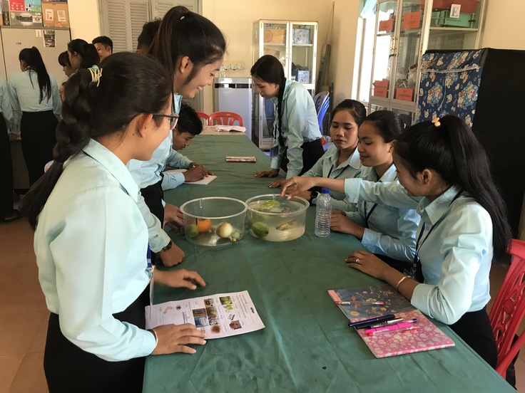 教師になるという夢を持ったカンボジアの学生たちが協力して理科の実験やその発表を行っている様子です。