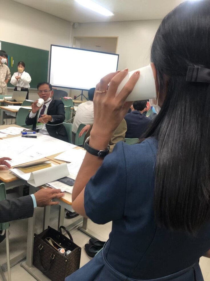 このワークショップでは、IBLに基づいた簡単な理科の実験を題材に、それをどのように児童生徒に教えるかを考えました。写真は、糸電話の実験をしている様子です。