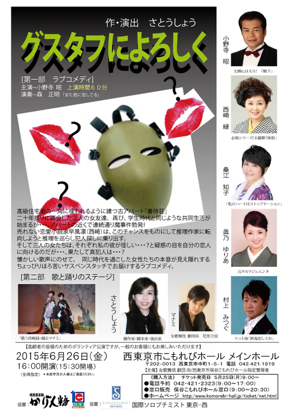 今回は女歌舞伎「劇団尚」の華麗なるショーステージと共に、ボランティア活動にご賛同下さったキャストの皆様のご協力を得て、現代劇のサスペンスラブコメディ「グスタフによろしく」を上演いたします。