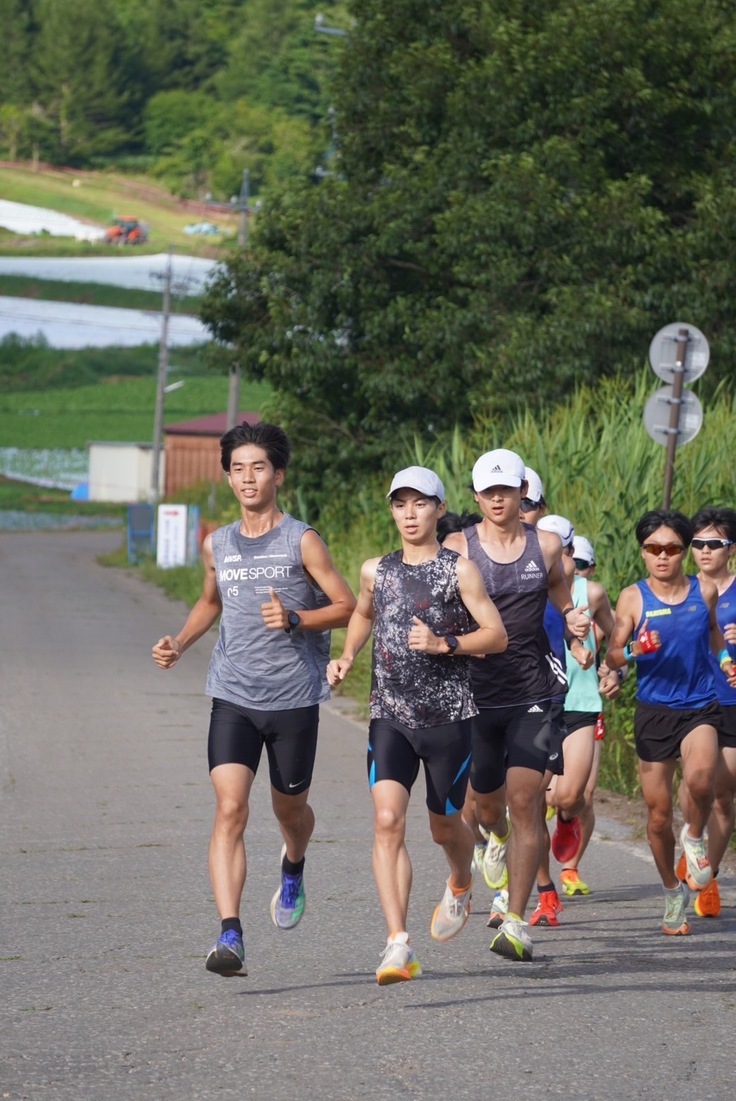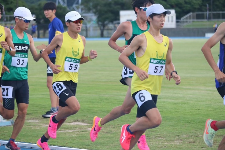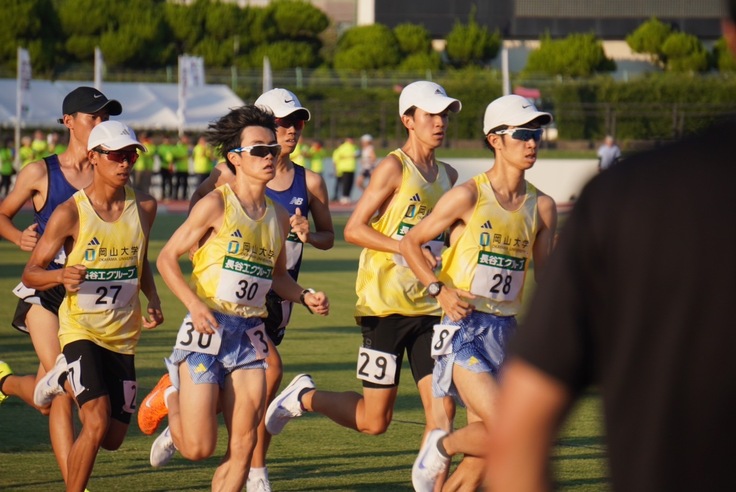 1組目は岡山大学から4名が出走しました。気温が30度を超える猛暑でしたが、プラン通り序盤から先頭集団を形成し、出走30名のうち6位以内に全員がゴール。誰一人として大きく遅れることなく次の組へ向けて流れをつけました。