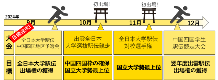 出雲駅伝、全日本大学駅伝の二つの全国規模の大会では国立大学勢最上位を目指します。出雲駅伝では中国四国地区の成績枠を確保をし、11月に行われる第68回中国四国学生駅伝では翌年の出雲駅伝の出場権を獲得することを目標としています。また、来年度以降も継続的に強化を図るため、温暖な環境で春季合宿を開催する予定です。