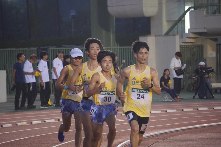 勝負が決まる最終3組目。エースの石鍋(4)・今シーズン絶好調の赤澤(3)らチームの主力4名を擁し、終始岡山大学の選手がレースの中心となりました。当初は、3000mまで旭・木戸・赤澤で3’00/kmでレースを進め、その後石鍋が抜け出すというプランでしたが、4000m以降で赤澤が先頭に。最終的に赤澤は全体1位のタイムでゴール、他の選手も3位〜5位に入り、組織力、勝負強さを見せました。