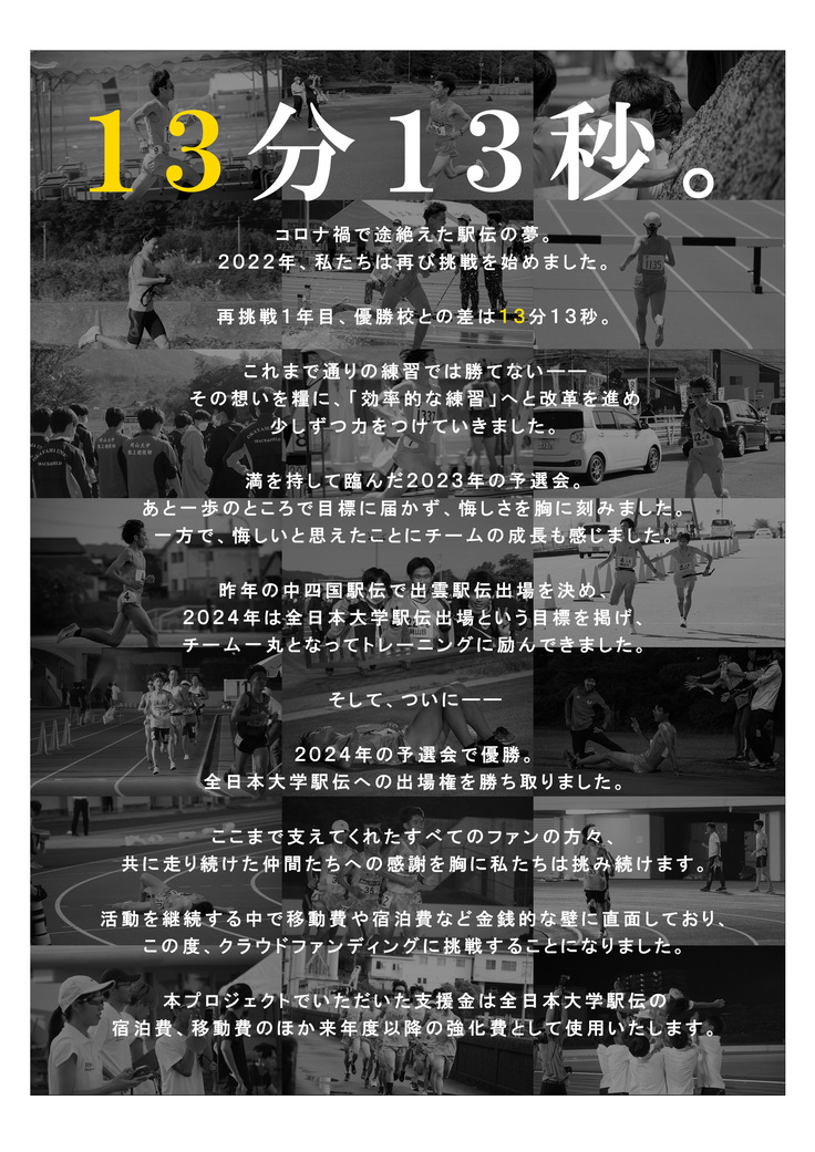 全日本大学駅伝の出場が決まったことで必要となる岡山から東海地方までの遠征費や、来年度以降「全国の常連へ」を体現するための強化費を我々が負担することは非常に困難です。これらの課題を解決するために本プロジェクトを立ち上げました。