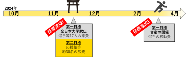 第一目標では、①全日本大学駅伝の計17名の旅費の負担(約¥1,000,000)、②温暖な合宿地で開催する春季強化合宿の移動費(¥200,000)を設定させていただきました。今回のネクストゴールでいただいた支援金は、全日本大学駅伝の応援・追加のサポートメンバー約30名の旅費(¥850,000)として、追加で充当させていただきます。