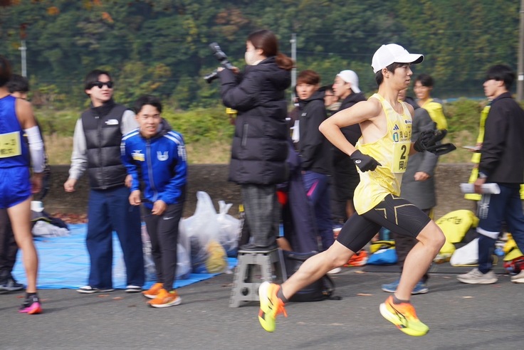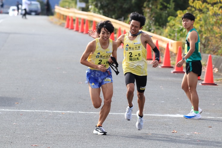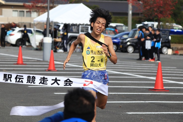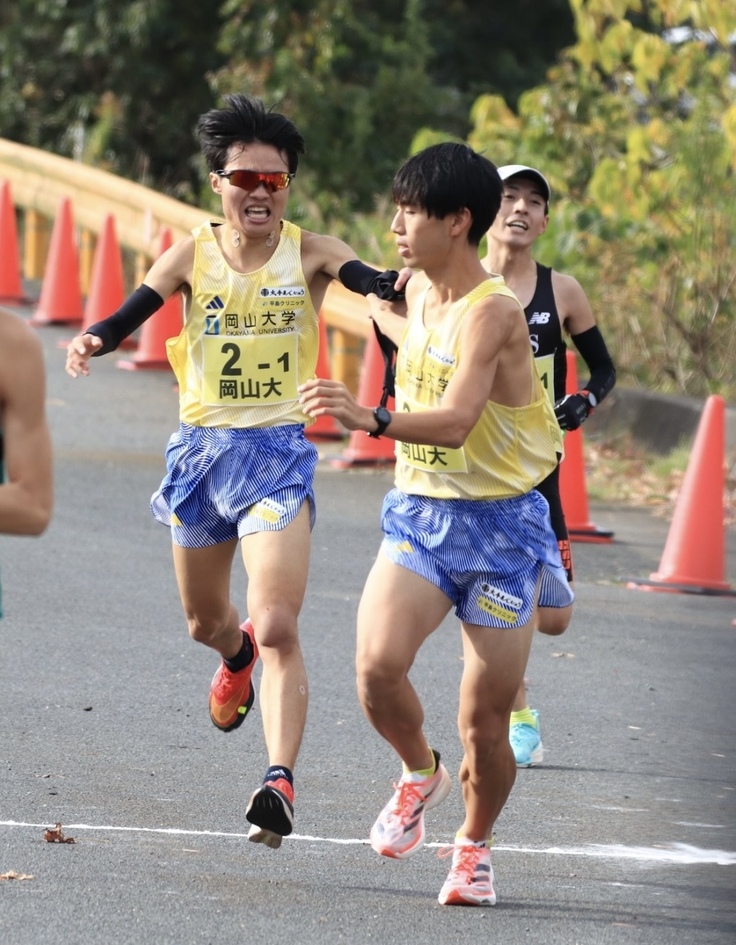 1区を走らせていただきました5年の岩﨑です。出雲駅伝、全日本大学駅伝に引き続き先日は沢山の応援誠にありがとうございました。個人としても思い入れのあるコースである1区の5回目の出走にあたって楽しみと責任を持って準備してまいりました。そんな中、前日の練習中に自身の不注意により左膝周囲を打撲してしまい、痛みを残したまま出走した当日は不甲斐ない走りとなり、応援していただいた方々へは申し訳ない気持ちでいっぱいです。しかし、このような状況でも信じてくれた後続のメンバー、全力で応援して下さった方々には感謝しかありません。昨年の歓喜だった2位が今年は悔しい2位となった経験を来年以降必ずチームで活かしていきたいと思います。今後とも全国の常連を目指してまいりますので岡山大学の応援をよろしくお願いいたします。